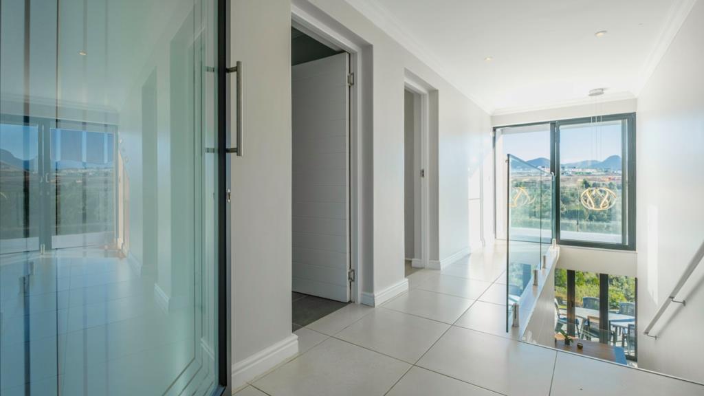 On the lower level, the home opens into the heart of the living space, an inviting open-plan area that brings together the lounge, dining room, and kitchen in effortless harmony. The kitchen is both modern and practical, featuring soft-closing cupboards, a walk-in pantry and a separate scullery. Stacking doors from the dining area extend the living space to a covered patio with built-in braai, perfect for relaxed entertaining against a spectacular mountain backdrop.