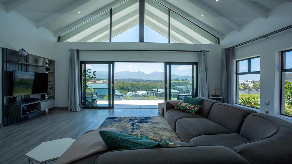 North-facing and filled with warmth throughout the day, the home frames uninterrupted views of the Outeniqua Mountains and welcomes beautiful morning light. The main bedroom sits privately on the upper level, featuring a walk-in closet and full en-suite bathroom, offering a peaceful retreat.