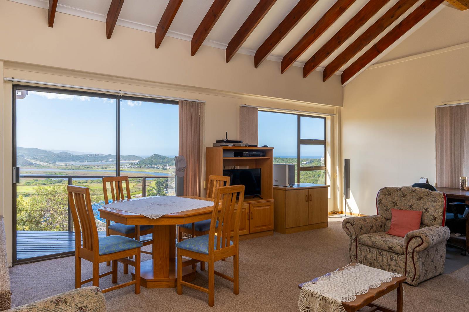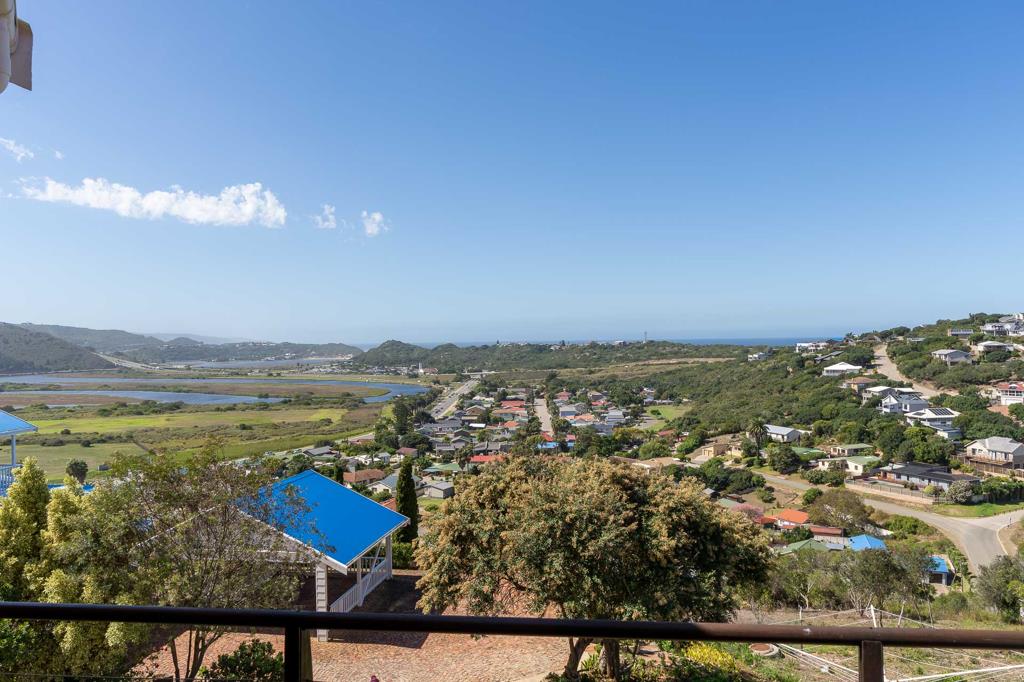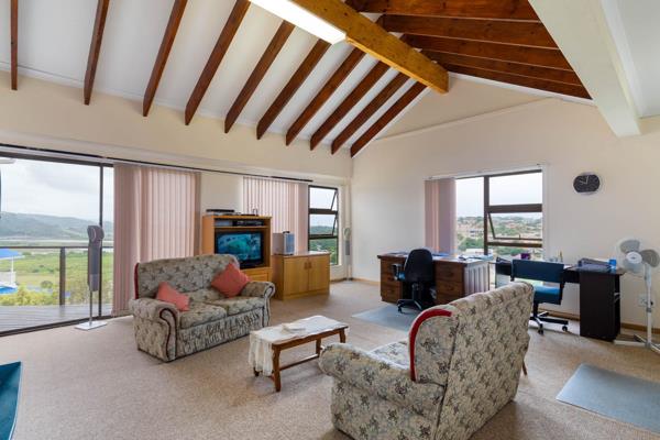 This solid and well-maintained home with a dream location enjoys an abundance of natural light throughout. Spectacular views of the river, mountains, ocean and beyond. Let the incredible sunrises wake you up with a first cup of coffee. The superbly spacious home is spread over two levels, with the upper floor boasting an open plan livingdining room, kitchen with lots of cupboards, granite working tops with adjacent scullery and in-house access from the double garage. Main bedroom en suite, second bedroom, bathroom and a formal lounge. The bedrooms are all spacious, fitted with carpets and built-in cupboards. This floor is also wheel chair friendly and a happy place. The owners who love their home and lived there for many years, decided after much consideration it was time to downsize. The lower level can function on its own, and boasts a large dining room, kitchen with oven and gas hob, living room with built-in braai, study, 4 spacious bedrooms, and 2 bathrooms 1 en suite. 3 Doors lead out to the garden. Double carport, ample parking, store room and a generator for load-shedding hours are all inclusive in this offering.