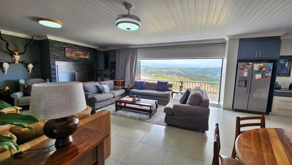 Open-plan dining, two lounges, and kitchen areas , opening through stacker doors onto a balcony with lovely views. One of the lounges features an indoor braai area, perfect for entertaining. The well designed kitchen is fitted with quartz countertops, a gas hob, and a separate scullery and laundry area.
