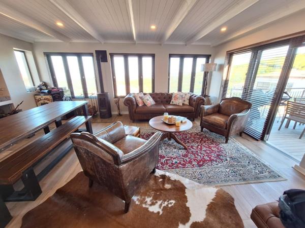 Nestled within the esteemed security estate of Bergsig, Groot Brakrivier, this distinguished residential property offers an unparalleled coastal lifestyle, boasting magnificent scenic and sea views. The residence presents a striking kerb appeal with its well-maintained cream-colored exterior, classic red tile roof, and a meticulously paved driveway leading to an integrated double garage. The presence of prominent solar panels immediately signals a commitment to modern energy efficiency, enhancing the property''s sustainability profile.