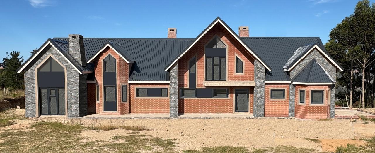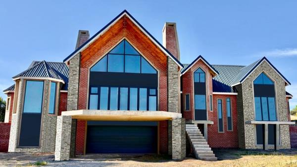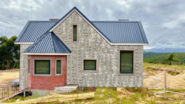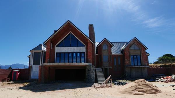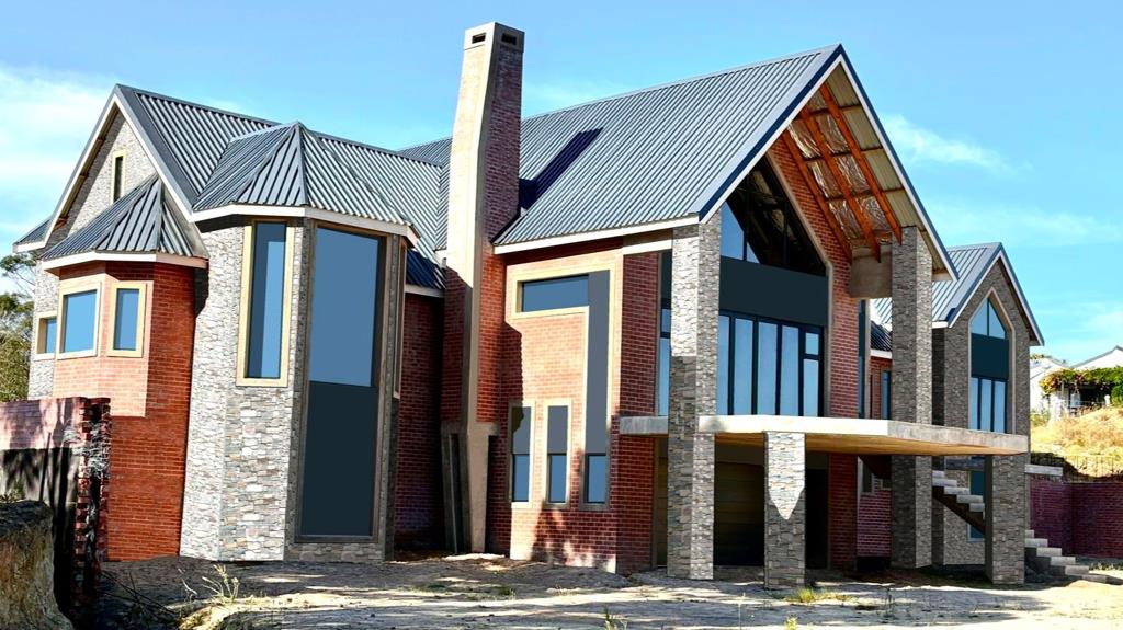 Complete this architectural masterpiece on 1,2ha land that is zoned architectural Zone 2, with beautiful ocean and valley views . The inside is still a blank canvas that awaits for the touch of uniqueness. The property consist of a spacious study, 4 bedrooms 3 bathrooms with the main ensuite bedroom on the Western side of the house.The ceilings is double volume with high exposed beams. There are plenty of windows to give a lot of natural light. The open plan kitchen with its separate scullery and spacious living areas with a built in braai opens to a balcony with amazing views of the valley and ocean . A loft in the living area could be used for a hobby room or extra bedrooms. A double garage with an extra tandem parking and storage room just adds to this impressive property and has direct access to the living area. The First 6 photo''s is a presentation of how the completed house will look with cladding.