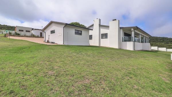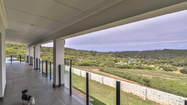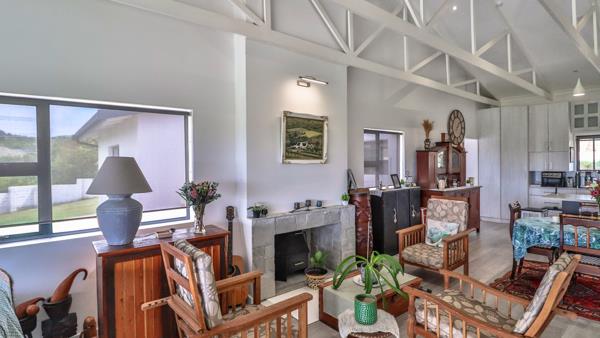The double-volume, open-plan living area seamlessly connects the stylish kitchen, dining area, and cozy lounge with a fireplace. The indoor braai area, featuring 5-panel stack doors, opens onto a spacious stoep with panoramic views of the surrounding landscape. On the northern side, an additional open stoep invites the winter sun, making it a perfect spot for relaxation year-round. The home also includes a laundry room and a double garage with direct access to the house.