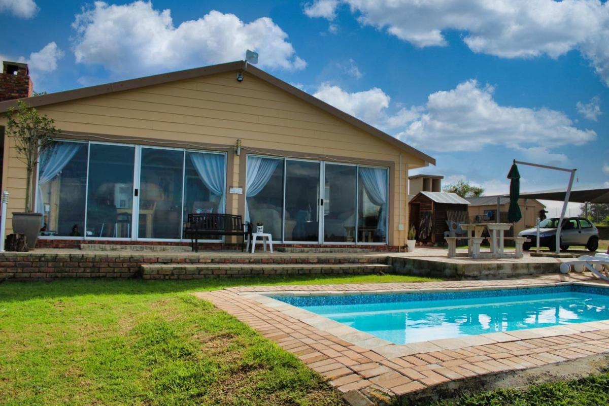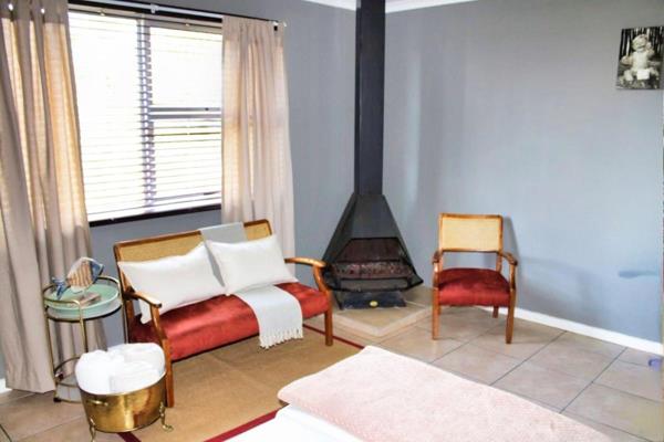 A built-in indoor braai extends from the open-plan living space, while wide sliding doors lead to a landscaped garden and sparkling swimming pool, creating a true indoor-outdoor lifestyle with sweeping views of the surrounding countryside.