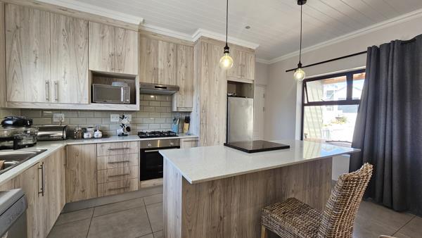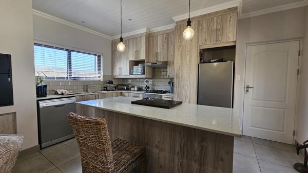 The open plan kitchen features trendy cabinetry, easy quartz tops and a gas stove flowing effortlessly into the lounge and dining area with built in braai for your convenience.