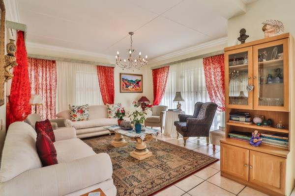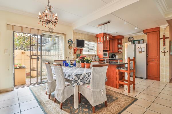 The open-plan lounge and dining area is sun-filled and offers a cosy atmosphere. Leading off the dining area is a sliding door that offers access to the outside paved area, where you can enjoy a braai with friends and family. The kitchen is well equipped and offers ample built-in cupboards and an under-counter oven and hob, granite countertops, and a separate scullery/laundry. Off the kitchen is a small enclosed stoep with a wash basin.