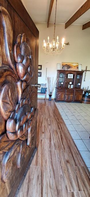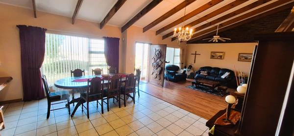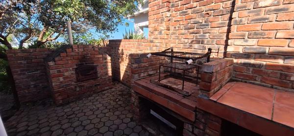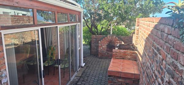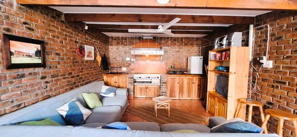 This inviting seaside residence features a beautifully handcrafted solid wooden door that opens into a spacious open-plan lounge and kitchen, complemented by a slightly separated built-in braai area. The high, open roof trusses enhance the sense of volume and space within the property. The kitchen is equipped with an abundance of solid wood cabinets, a breakfast nook, and a separate laundry area. The indoor braai and entertainment space includes sliding doors that lead outside to a cozy pizza oven, serving as the centerpiece for gatherings.