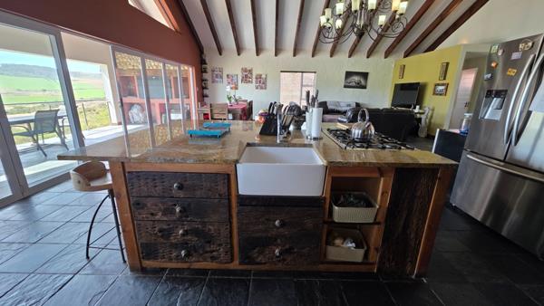 This very neat and large (364 m) house is waiting for the entertainer that loves to treat his friends and family with a braai whilst enjoying the unrestricted rural and mountain views of the Garden Route. Situated in one of the most popular streets in the neighborhood this house has been designed to be different from other dwellings and will be appreciated by the discerning buyer that trends to be daring and bold in his taste for style. Upon entry you will find a large open plan living area with stacker sliding doors opening fully upon a spacious veranda with a large built-in braai, kitchen with a built-in cole stove and separate scullery as well as a large island cabinet fitted with a gas hob, spacious home office or pool room and a guest toilet for your convenience. Downstairs you will find a TV lounge, three bedrooms with access to the outside and three bathrooms en suite as well as two garages with direct access into the house for added safety and convenience. The yard is totally fenced at the back for your kids to play and for safe keeping of your four legged friends. This house might be out of the ordinary but can be perfect for those that dare to be different and for more information or appointment to view you are welcome to contact me.