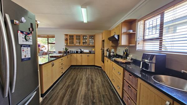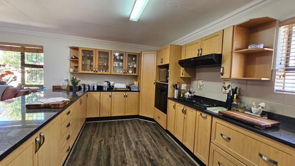 An open plan kitchen and living area leading to an enormous braaientertainment room with built in braai and views over the lush garden.