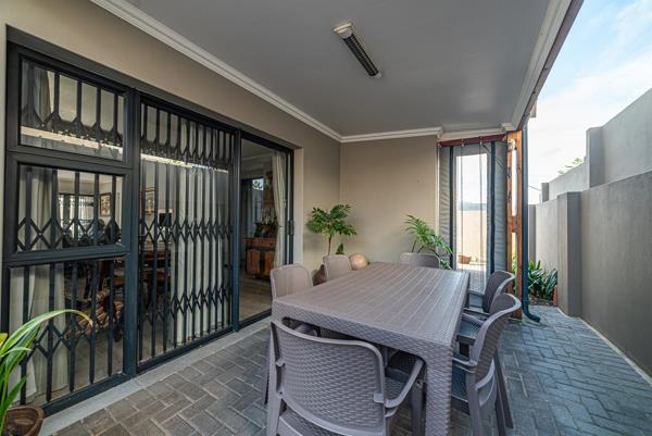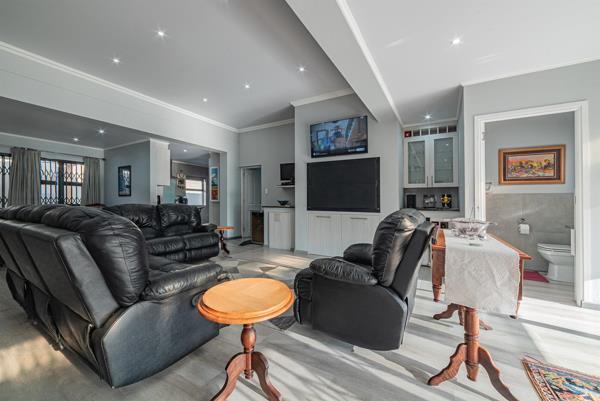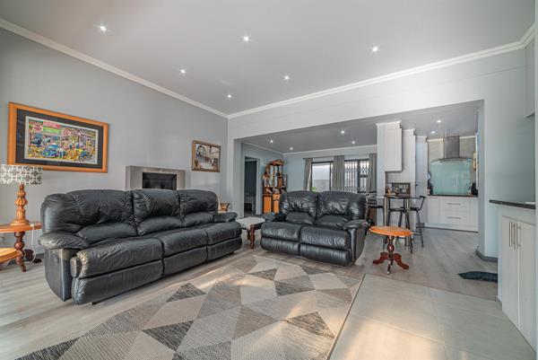 Lounge with a cosy gas fireplace and build-in braai and exits to a covered patio via large glass sliding doors secured with Trellises