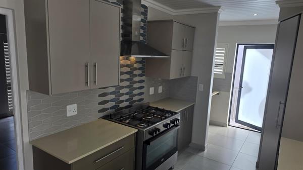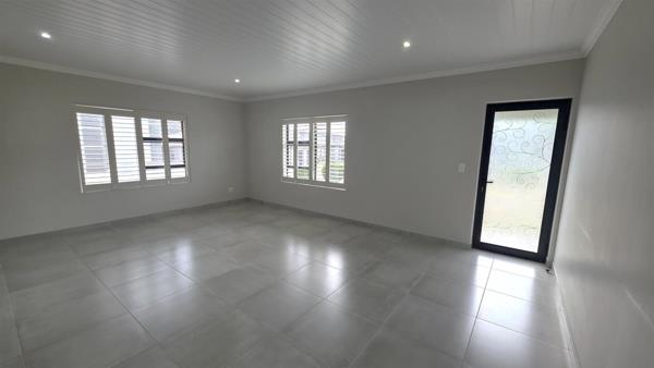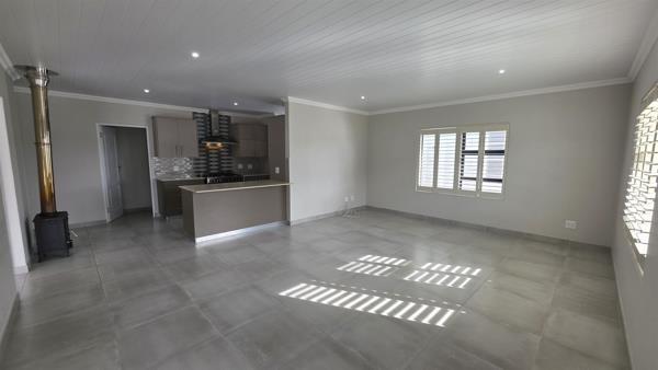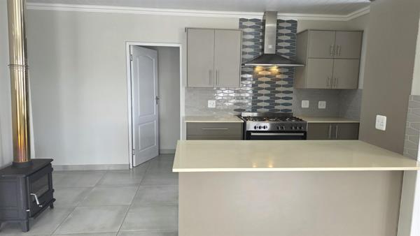 The open plan living areas are situated all on one level and consist of a lounge, dining area and kitchen with quartz counter tops and a scullery with place for a dishwasher and a door leading outside. The lounge has a glass door flooding the area with natural light, making it the perfect spot to relax and unwind, as well as a fireplace for the cooler winter months.