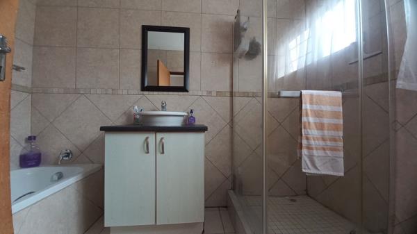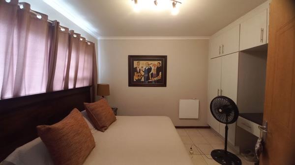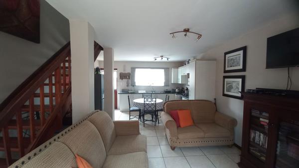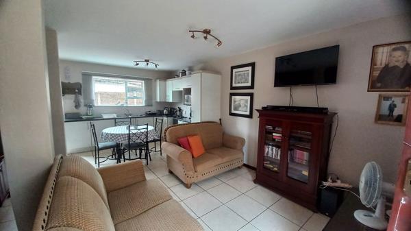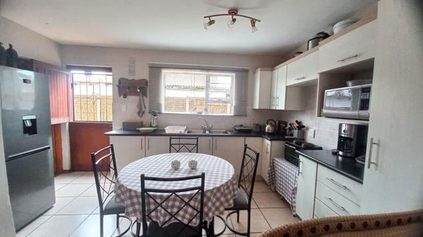 Built with durability in mind, the apartment features face brick walls and aluminum windows that require minimal upkeep. The open-plan living areas are bathed in natural light, creating a bright and airy atmosphere. The spacious lounge, dining room, and kitchen flow seamlessly together, with the kitchen designed for practicalityfeaturing modern cabinetry, generous storage, and ample counter space. A back door leads from the kitchen to the garden, with convenient access to the garage.