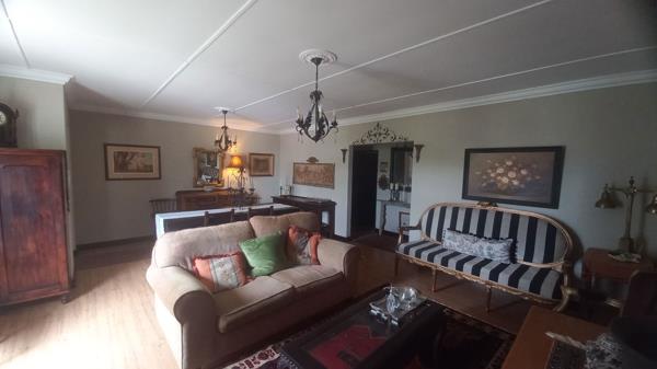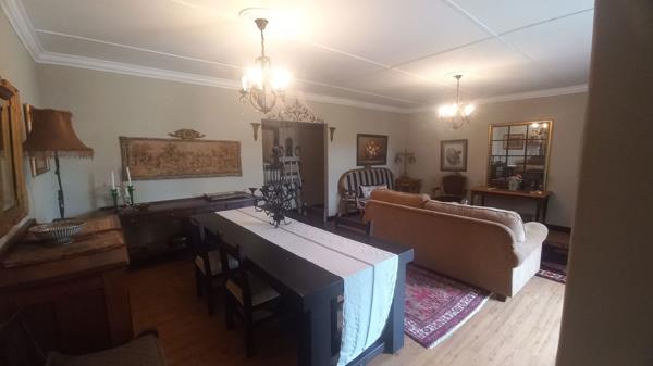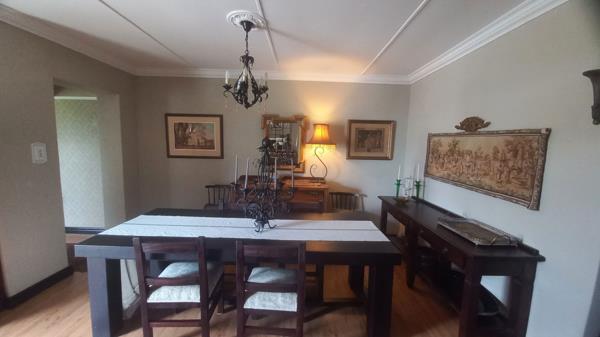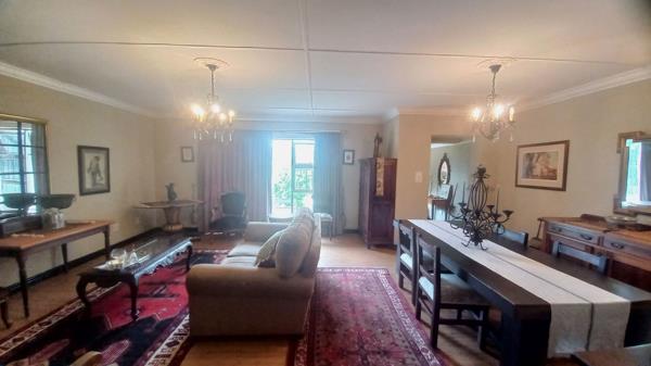 The formal lounge is generously sized, featuring a built-in fireplace and air conditioning, offering a cozy retreat for winter evenings. Adjacent to the lounge, the entertainment area with a built-in braai. The two wooden doors open up to the beautiful back garden, ideal for both summer and winter gatherings.