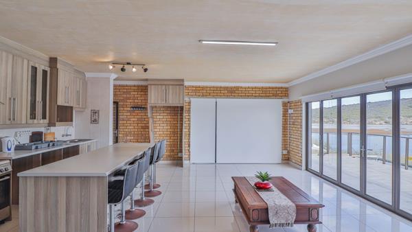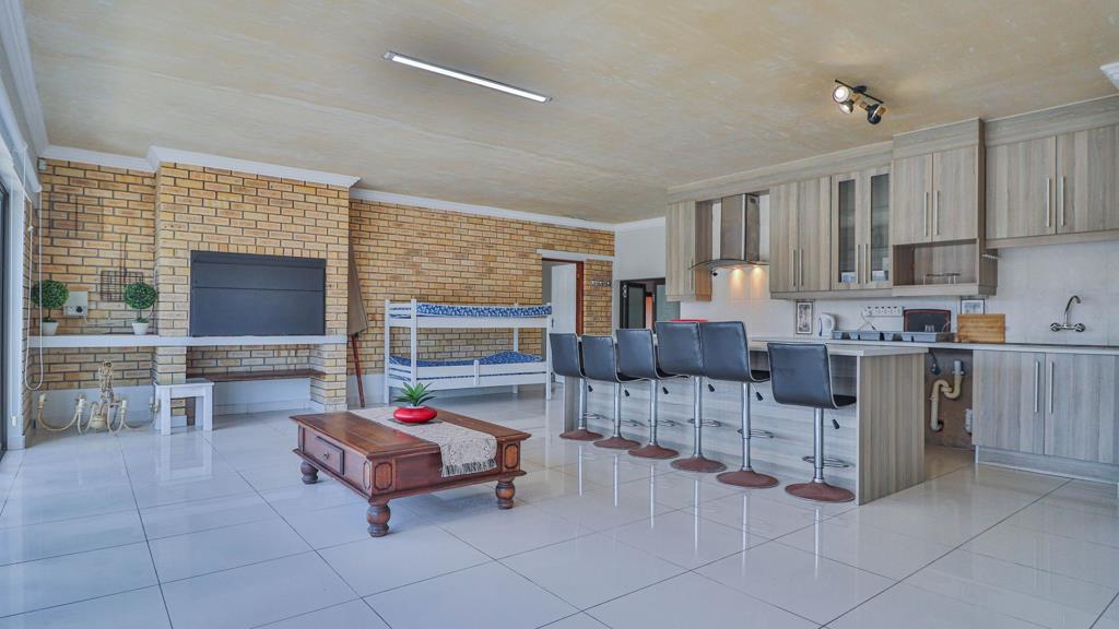 Expansive open-plan living area with lounge (built-in braai), dining room & kitchen.