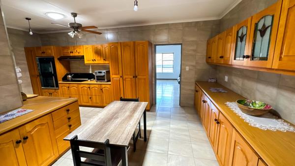 The home welcomes you with an inviting open-plan living and dining area featuring a built-in braai perfect for year-round entertaining. The well-equipped kitchen includes ample built-in cupboards, two eye-level ovens, and an induction stove with a gas plate. A separate laundry and pantry add everyday practicality, while a private office near the entrance provides the ideal workspace.