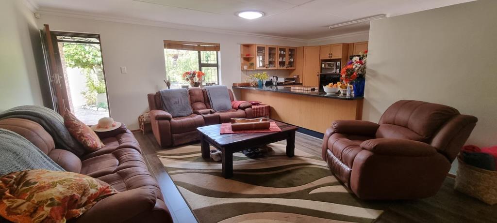 The open plan kitchen, lounge and dining area have a seamless flow into the entertainment space, creating an ideal setting for relaxation and entertainment. The kitchen features an eye-level oven, gas hob, pantry cupboard, granite counter tops and a handy separate scullery.