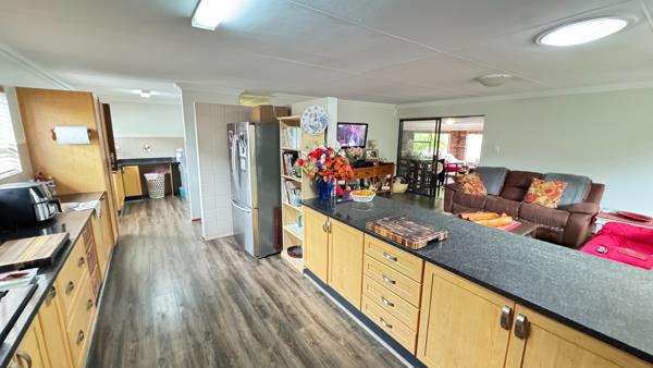 The spacious open-plan living area forms the heart of the home, seamlessly connecting a welcoming lounge with a farm-style kitchen featuring granite countertops, a gas hob, large electric oven, pantry cupboard, and a separate scullery/laundry. The flow continues onto a large enclosed entertainment patio with a built-in braai, creating the perfect indoor-outdoor space for year-round gatherings.