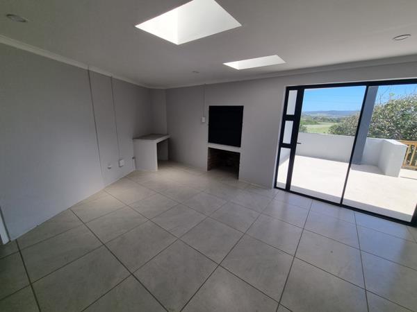 The open plan living areas have a seamless flow between living, dining and kitchen areas. A spacious room for entertaining and relaxing in, features a built-in braai and opens out onto a balcony from which there are landscape views. The kitchen and bedrooms have no built-in cupboards so can be customised to suit your style and perferences, on own costs.