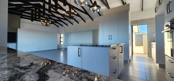 Exquisite, exposed beamed ceilings throughout the open-plan kitchen, lounge & dining room give a feeling of airy spaciousness. The large indoor braai/fireplace in the lounge leads out onto an open patio through glass doors which opens up the entire house inviting the outdoor sea breezes in. 3 lovely fitted bedrooms, 2 gorgeous bathrooms, double automated garage with a laundry facility are all part of the offering of this delightful residence. This dream home boasts top-end finishes and will set itself apart as regards quality.