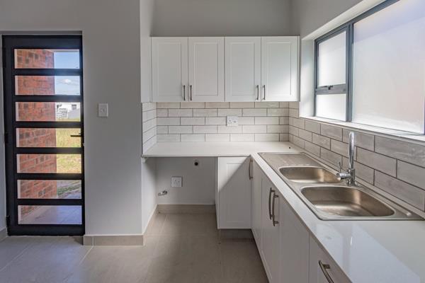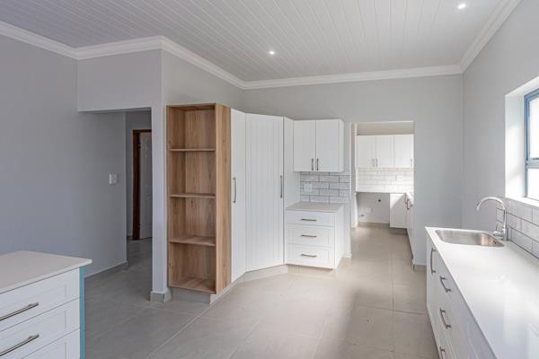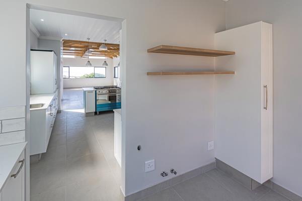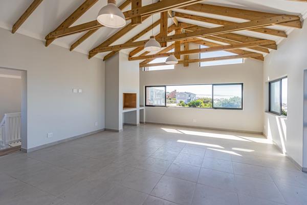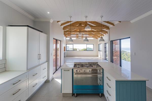 Open-plan living-, dining- and kitchen area, with built-in braai, where the family can all get together. The windows slide fully open.