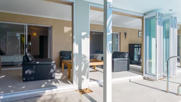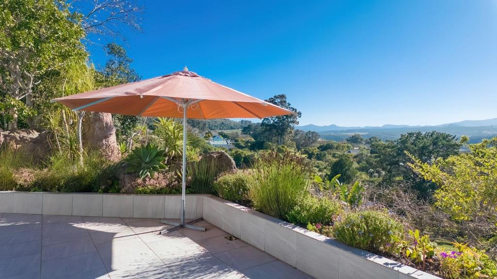 Patio - This sunny covered patio opens up onto the paved entertainment area with large Swimming Pool and secluded Dining Area tucked away at the far end with a tranquil natural stone water feature. This all overlooks the beautiful indigenous garden and once again has uninterrupted views of the Knysna Lagoon.