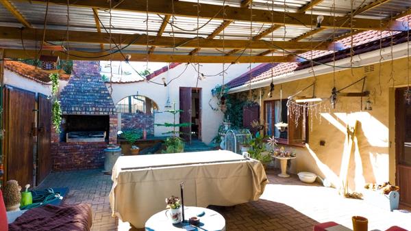 A spacious lounge leading to an entertainment area with braai