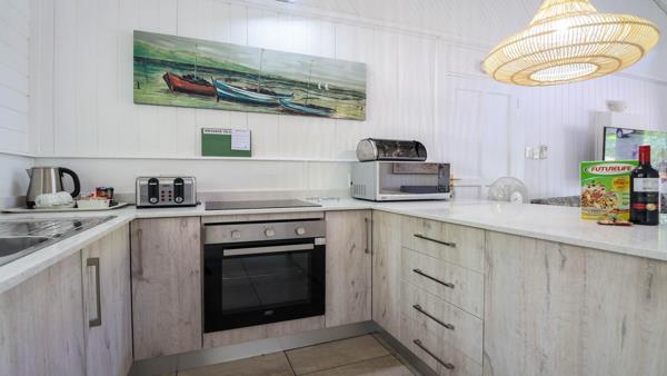 It is a two bedroomed unit with a modern bathroom shared between the bedrooms. The kitchen is open plan with granite topped work areas. It opens ober the breakfast nook to the dining and lounge area. Off this area is a lovely covered deck where a weber braai is provided. The finishes are up market and the chalet is spacious, light and airy. The complex provides wonderful entertainment areas for guests or residents to enjoy.