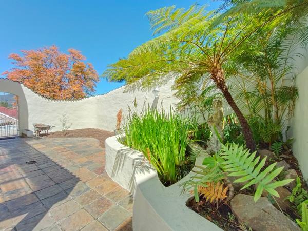 The covered patio has a distinct Mediterranean feel, framed by ferns, a small fishpond, and resident Knysna Banana Frogs. The layout flows effortlessly from the kitchen through to the patio, making it perfect for entertaining or relaxing in the quiet garden courtyard. The property is surrounded by neat brick paving all around, giving it a clean, estate-style appearance that requires almost no garden maintenance. Yet, theres still enough space to create your own touches with pots, ferns, or even a small herb and veggie garden. Theres no need for a lawn mower, just pure enjoyment and easy living.
