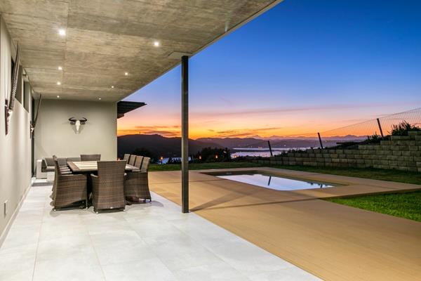 The clean-cut recent build double-storey flows effortlessly down to the barbeque deck, with its clever built-in concrete bar and Boma, making an impressive entertainment area. This is a proudly warm, welcoming hospitality home, for family life and pleasurable entertaining. The essence of the build on this unique estate is to enjoy the colour-filled sunsets across the expansive Knysna Lagoon.