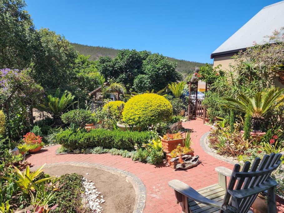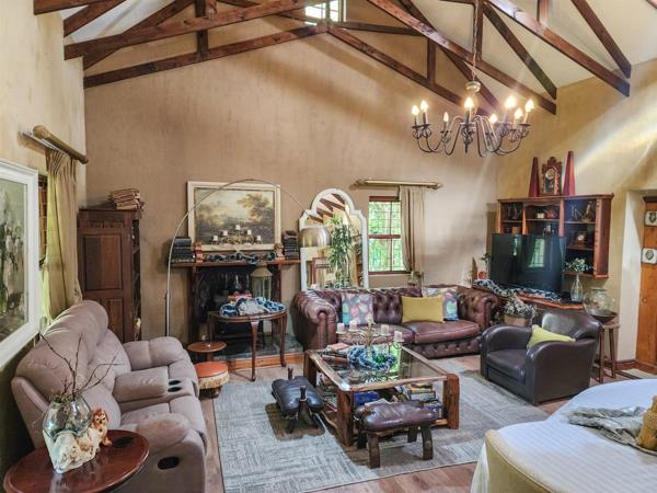 The open plan lounge and dining area, with a woodburning fireplace, flows into the kitchen as well as flowing out onto the private patio with a braai area within another lush corner of the garden.