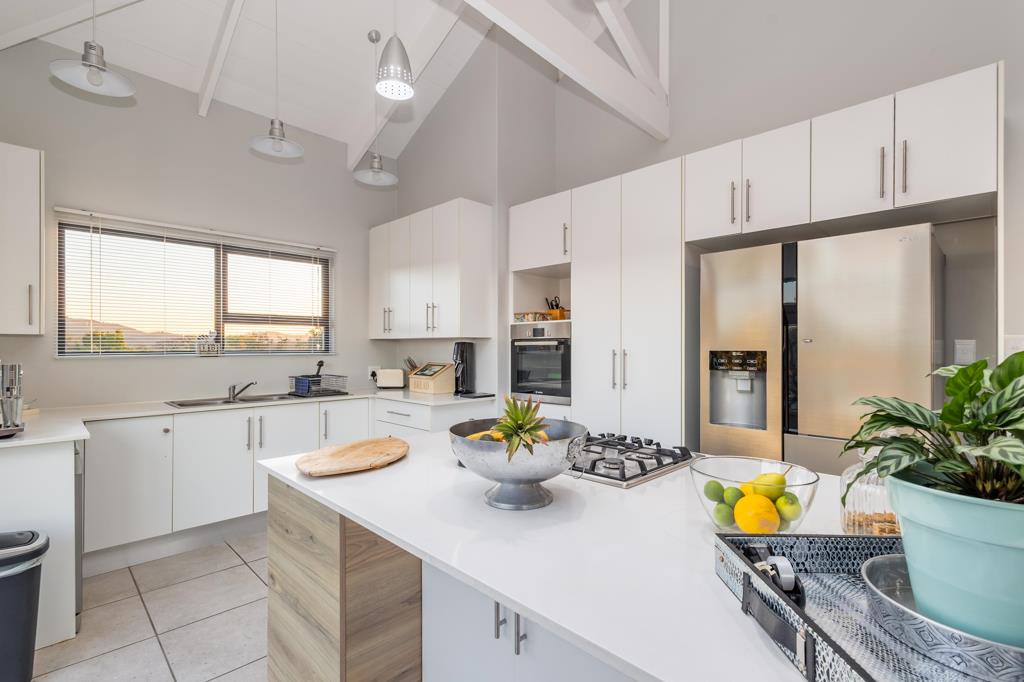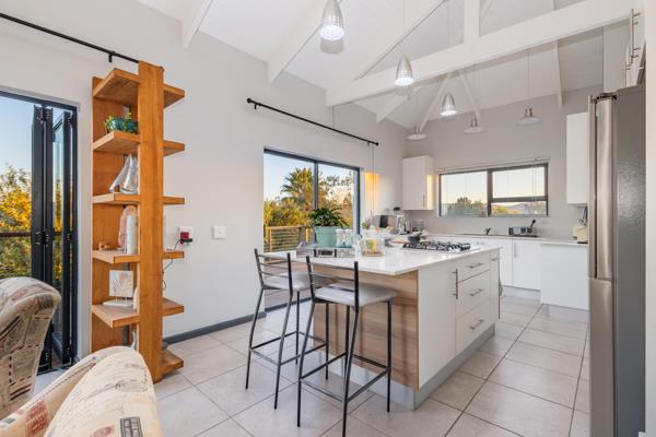 The open-plan kitchen, fitted with Caesarstone countertops and a gas hob, flows seamlessly into the lounge and dining area with stacking doors opening out onto an inviting deck, where you can enjoy tranquil views over the lagoon while preparing a meal.