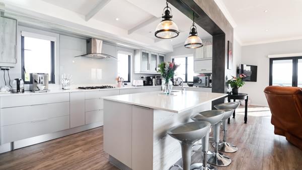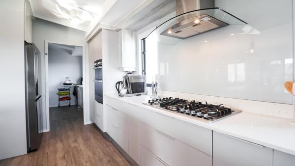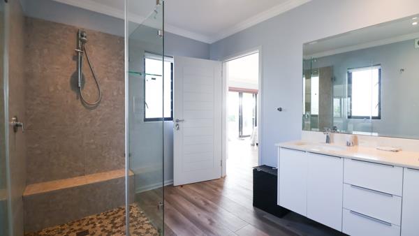 Downstairs offers an entertainment lounge, bar, braai room, and four additional bedroomsone of which is a self-contained flatlet with a private entrance, perfect for Airbnb. Three bedrooms open onto a generous deck with low-maintenance Belleau wood, a rim-flow pool, and a Jacuzzi with a water recirculation system.
