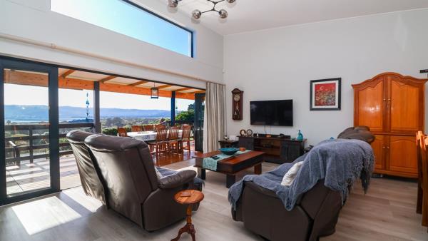 When you enter the home, you are taken in by the incredible view over the Lagoon and Knysna. The living area, kitchen, deck with build in braai and main bedroom are all on the same level.