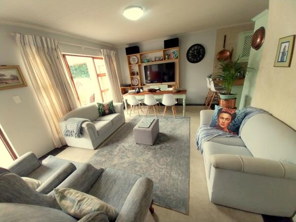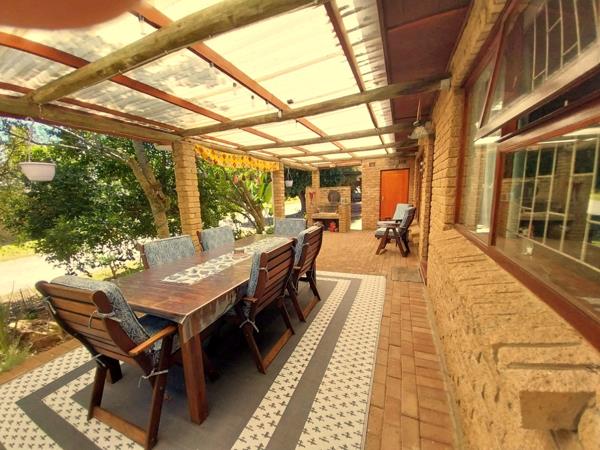 The covered front veranda with built in braai, welcomes you into the comfortable open plan living area and on into the kitchen, well fitted with ample cupboards, a 4 plate gas hob No ovenand place for a microwave.