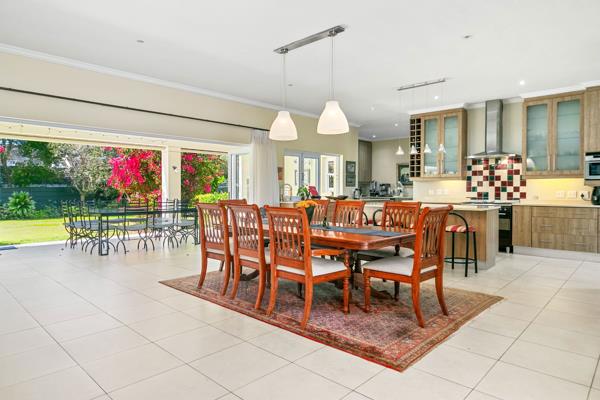 Designed with generous proportions, high ceilings and superb natural light throughout, the home exudes a calm, uplifting ambience. The open-plan living, dining and kitchen areas form the convivial heart of the home, framed by a majestic wood-burning fireplace and opening seamlessly through glass bi-fold doors onto an extra-deep, all-weather verandah. Complete with built-in braai, lounge and dining space, this sheltered outdoor area invites year-round entertaining.
