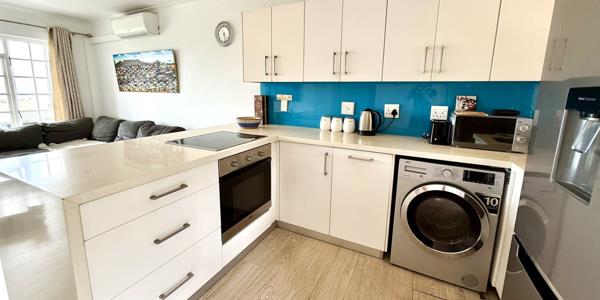 The open-plan lounge and kitchen area is fully equipped for modern living, featuring air-conditioning, a TV, DSTV, and an internet connection. The kitchen comes complete with high-end appliances, including a fridge/freezer, dishwasher, washing machine, microwave, and an electric stove with a hob.