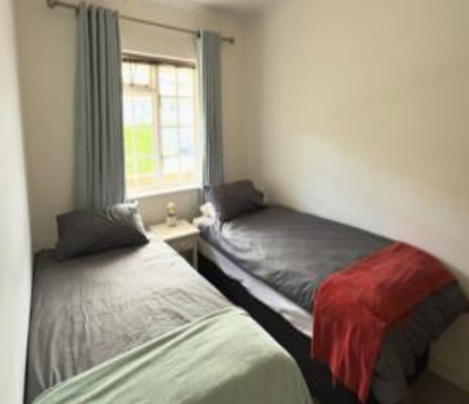 Two Bedrooms: A main bedroom with a queen-size bed and en-suite bathroom, plus a second bedroom with two single beds and built-in storage.