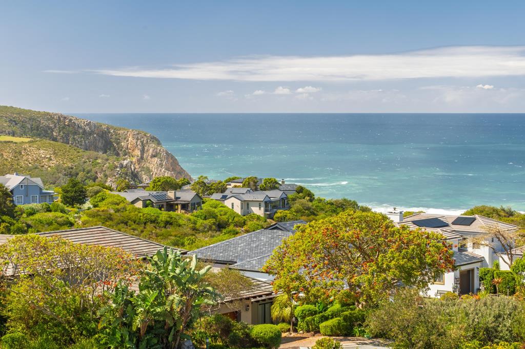Upstairs, the home opens into a generous open-plan living area that brings together the lounge, dining, window-bay sitting area and kitchen. The kitchen is both practical and social, featuring ample counter space, an indoor gas braai and access to a sheltered north-facing courtyard for sunny afternoons. On the southern side, glass doors open to a wide deck with expansive views of the coastline and ocean. The lounge is fitted with a no-vent gas fireplace, a built-in TV and ceiling-mounted speakers, creating a warm and inviting central space.