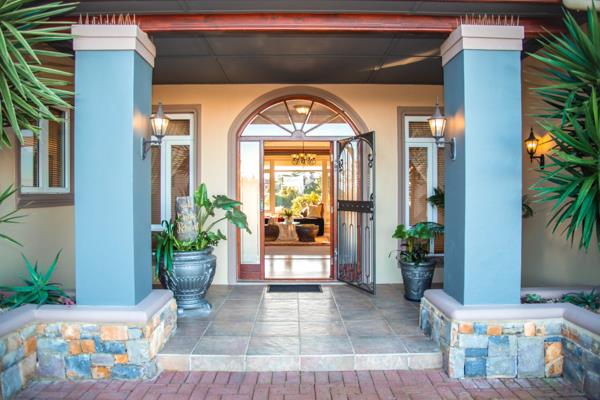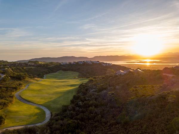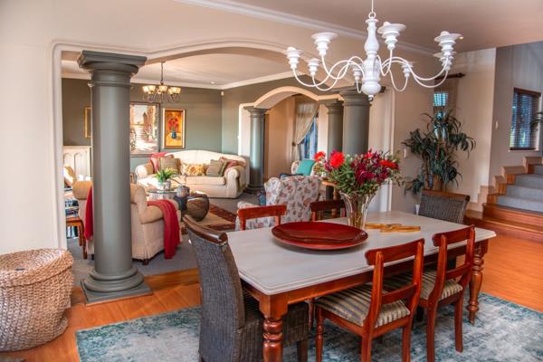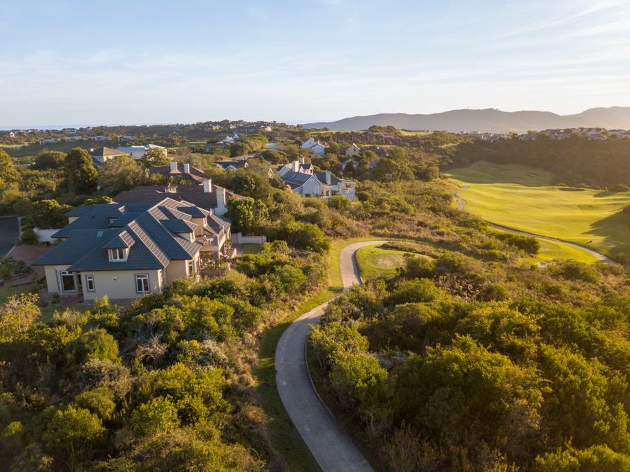 Ideally situated among undulating flowering fynbos, overlooking the lush green 7th fairway of the Pezula Golf Estate, this home also offers spectacular views of the Outeniqua Mountains and sunsets over the Knysna Lagoon. The décor has a pleasingly opulent feel and may be bought in addition to the home, where it tastefully styles this 4-bedroom, 4-bathroom home, surrounded in comfort and space with a clever use of colour. Two bedrooms are located upstairs, and two are downstairs, providing flexibility for family living and accommodating guests. The main bedroom is luxuriously comfortable and has a bright multi-mirrored dressing room.