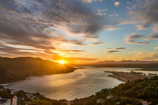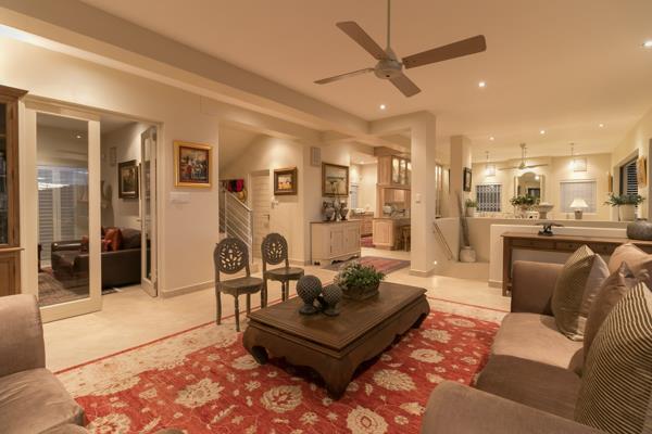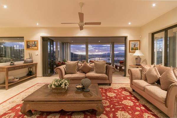 An expansive enclosed conservatory-patio with plantation shutters spans the front of the house which pours over the lagoons waterway panorama across to the Outeniqua mountains beyond. The house frames winter sunsets which often explode with fiery colours, always adding warmth into the home for the night.