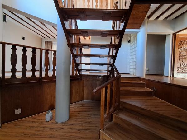 The ground floor of this property features an entrance hall leading into a spacious lounge/living room with carpeting, a dining nook connected to the kitchen with laminated floors, and a separate scullery. There is a guest/master bedroom on the same level, along with a guest toilet and wash hand basin.