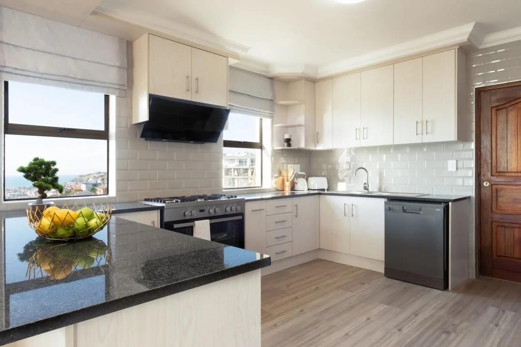 Kitchen: Modern kitchen with sleek granite countertops and a 5-plate gas stove, perfect for cooking enthusiasts