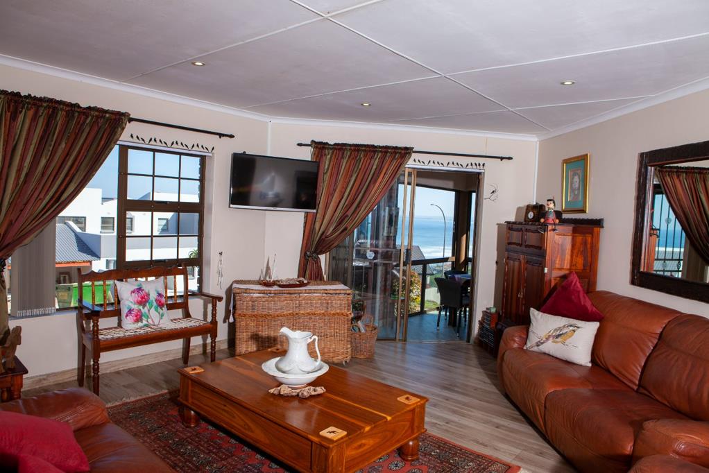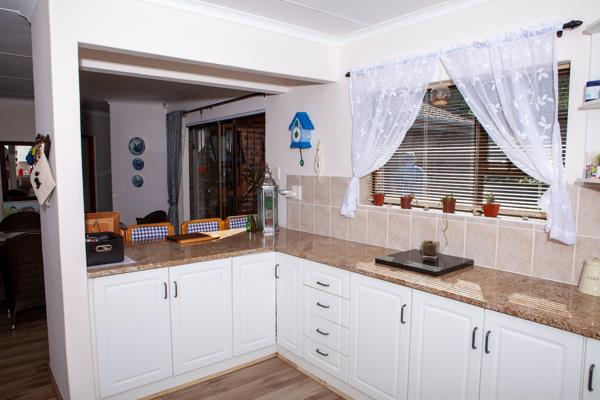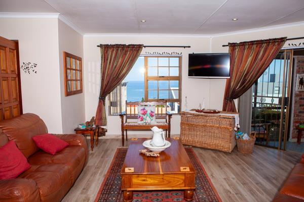 Inside, the home features three bedrooms with built-in cupboards, an open-plan living area, and an enclosed stoep that showcases beautiful sea views. The property includes two bathrooms, one of which is en-suite, as well as an extra bedroom with a shower and toilet adjacent to the house. A dedicated study or office provides a quiet workspace.