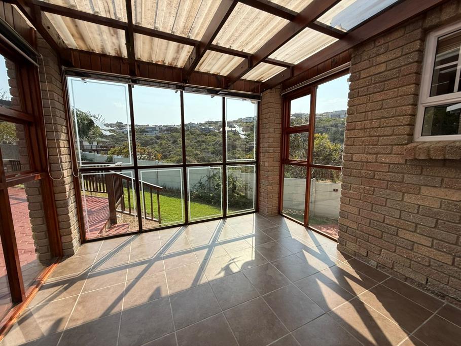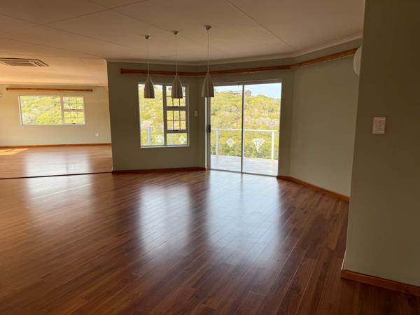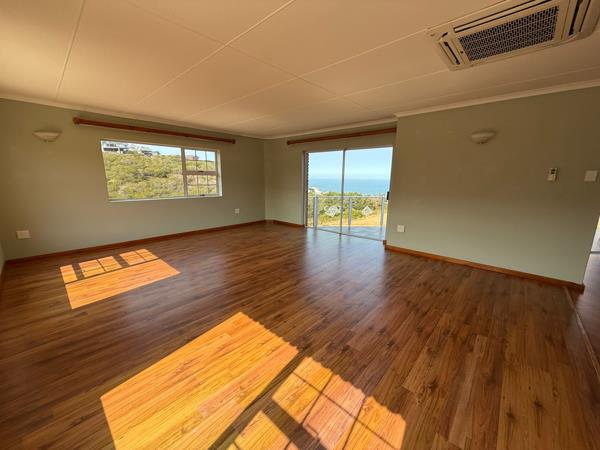 Enter through a sunny patio and step through a modern wooden front door into an open-plan dining room, lounge, and kitchen, all with stunning ocean views. The kitchen features ample cupboard space, an electric hob and oven. Both the dining room and lounge open up to a spacious balcony, perfect for relaxation and entertainment.