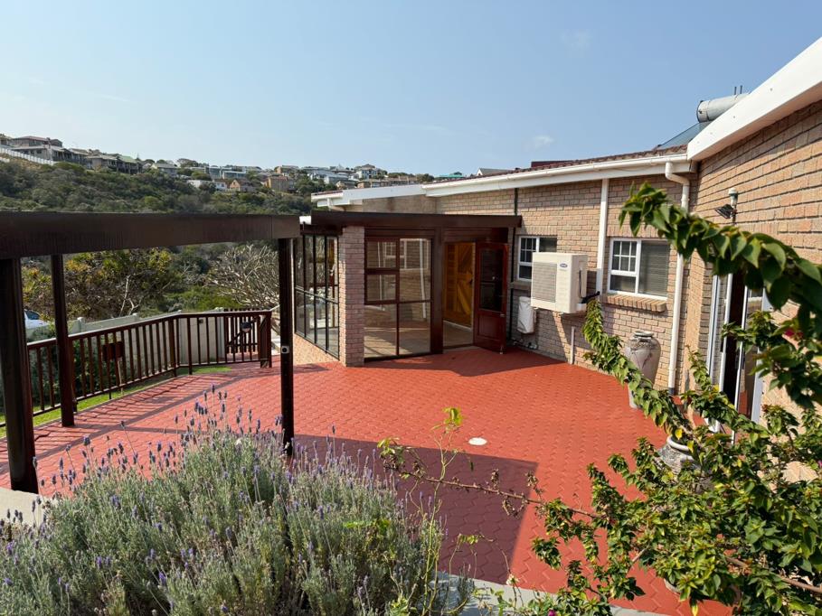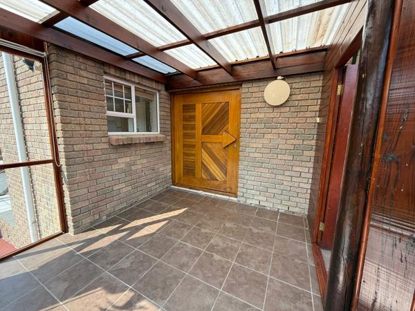 A patio with a closed braai room and built-in braai offers a perfect spot for outdoor entertaining. An additional room with laundry fittings can be used as a laundry room or office. The garden is beautifully established with a lush green lawn and variety of plants and trees.