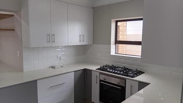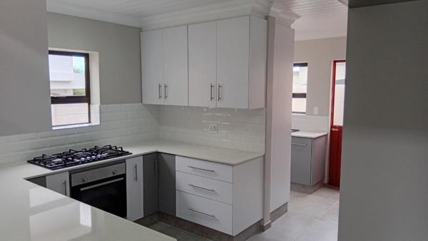 The contemporary kitchen comes fitted with a gas hob and an electric oven.The living area seamlessly extends to three comfortable bedrooms and two beautifully appointed bathrooms, with the main bedroom boasting a full en-suite for added privacy. The spacey double garage offers direct access into the home. Energy efficiency is prioritized with a gas geyser,and the sale includes a 19 kilogram gas bottle for your convenience.