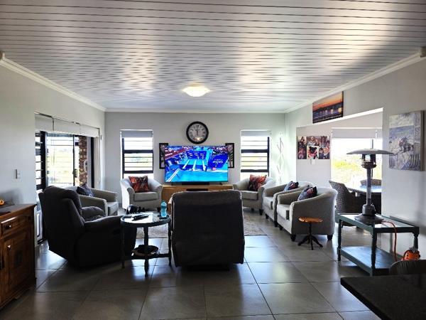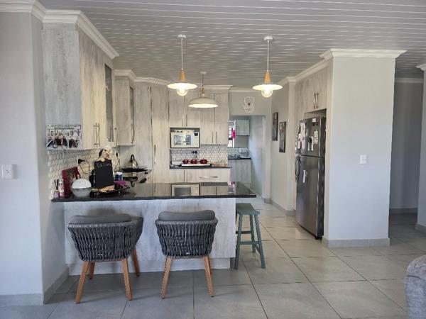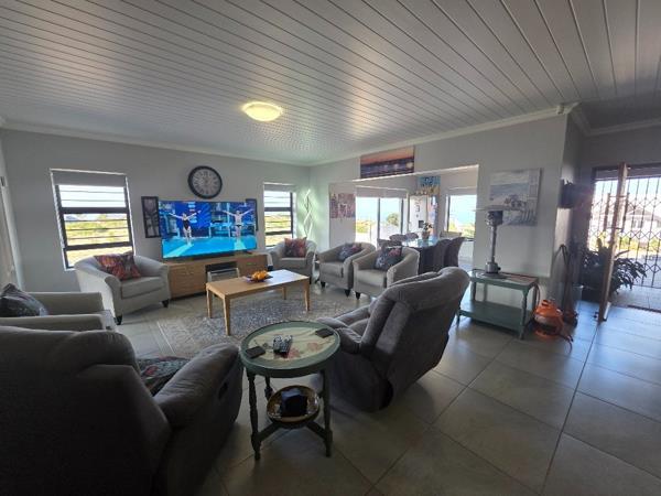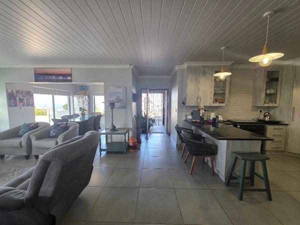 This home offers a spacious open-plan lounge seamlessly connecting to the dining area, which features a built-in braai and sweeping ocean views. The modern open-plan kitchen includes a separate scullery, ideal for culinary enthusiasts, with direct access to the garage. Sliding doors partition the lounge from the generous entertainment area, accommodating a dining table, lounge suite, built-in braai, wash basin, and worktops. Additional sliding doors open onto a wooden deck, providing a tranquil setting to enjoy serene surroundings and panoramic ocean vistas.