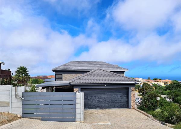 The open-plan lounge and dining area seamlessly flow onto a large deck with a built-in braai, perfect for entertaining while taking in breathtaking views of Boggoms Bay and Vlees Bay. The master bedroom also opens onto the patio through sliding doors, equipped with trellis doors for added security.