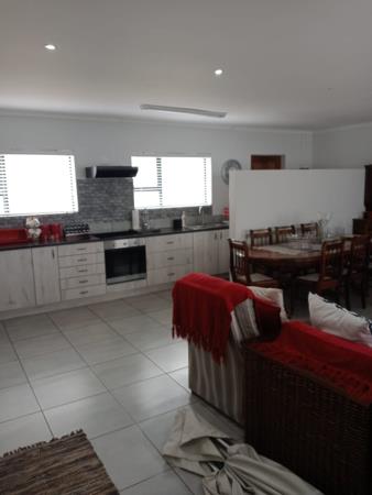 This spacious house offers endless possibilities as it can be divided into two separate homes. The first part of the house boasts a double-storey design with a covered patio that features a built-in braai. The open plan living room consists of a modern kitchen, complete with a pantry. Additionally, there is a guest toilet on this level.
