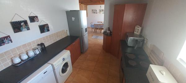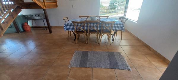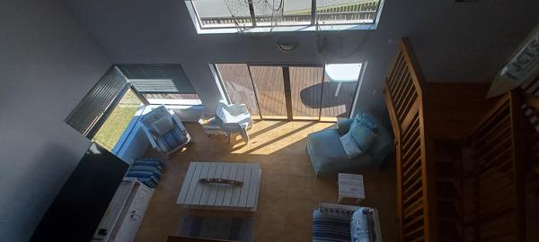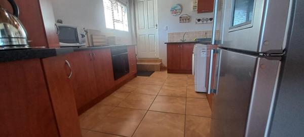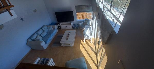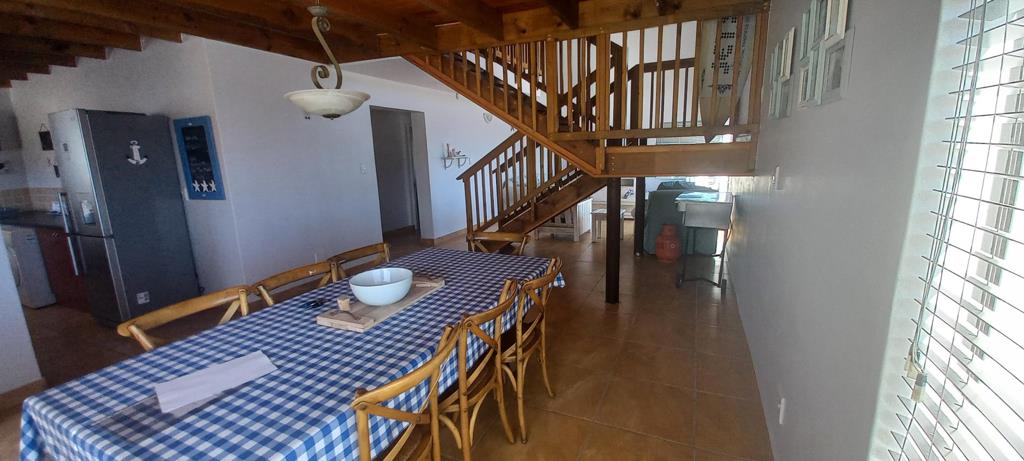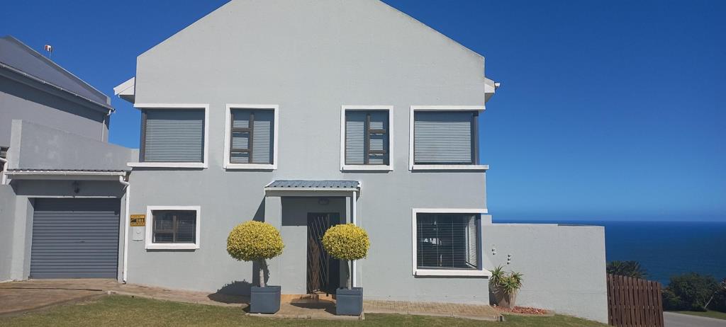 This beautiful double storey, duet home is centrally located. With a floor size of 220m2, it offers a comfortable living space with stunning ocean views! On the bottom section of the double storey home, are a spacious living- and dining area. The kitchen has many cupboards and leads to a single garage. The living area opens up to a huge wooden deck where you can view breath-taking ocean views! The living area also has is a guest toilet. The ground floor also offers a spacious main bedroom with a full en-suite bathroom.